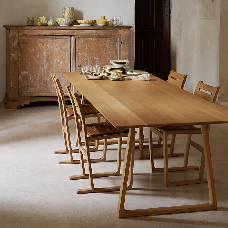 Na Hermès Home, especialmente nas linhas Équilibre e Matières, o luxo se expressa pela tensão perfeita entre rigor e sensibilidade. Feltros densos, couros tratados sem agressões químicas, tramas que pedem a mão antes do olhar. É design como gesto íntimo, não como espetáculo.